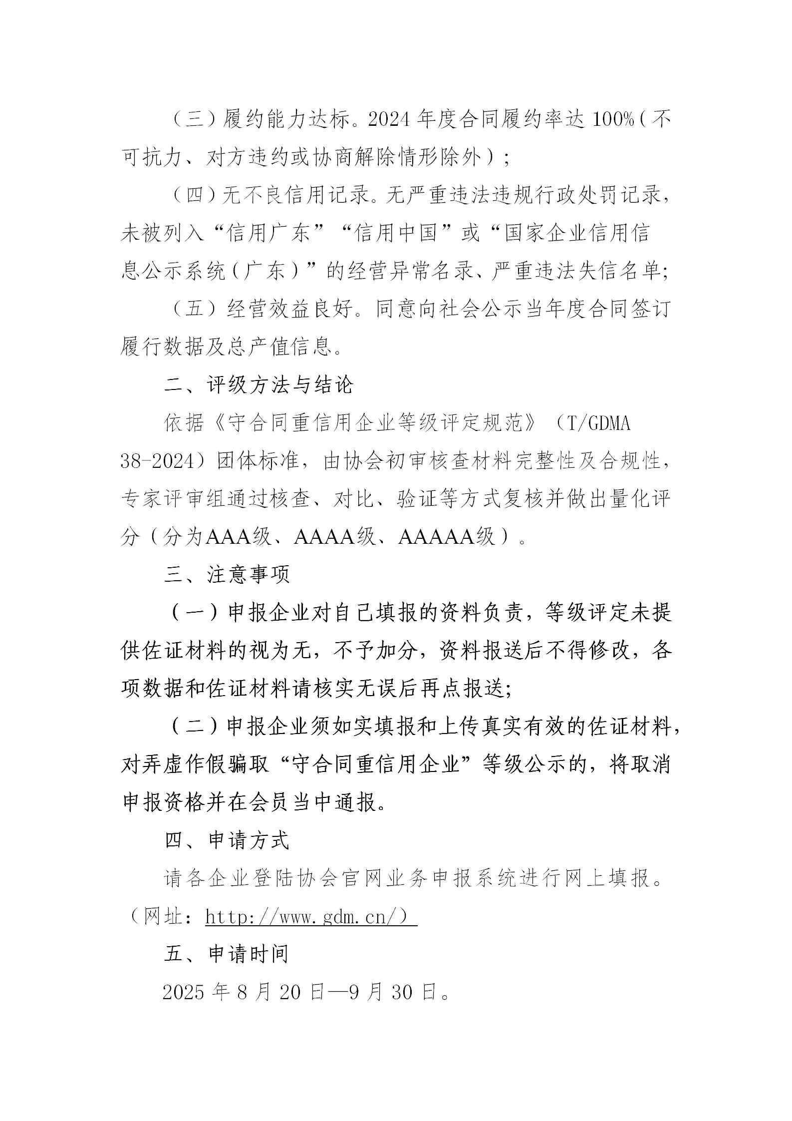 为贯彻落实《中共中央办公厅 国务院办公厅印发〈关于推进社会信用体系建设高质量发展促进形成新发展格局的意见〉的通知》(中办发〔2022〕25号)精神,以及广东省委省政府关于深化信用体系建设的决策部署,进一步规范市场秩序、优化营商环境,促进我省信用体系建设,助力“百千万工程”高质量发展和粤港澳大湾区建设,根据《守合同重信用企业等级评定规范》(T/GDMA 38-2024)团体标准,我会现启动2024年度“守合同重信用企业”等级评定工作。有关事项通知如下: